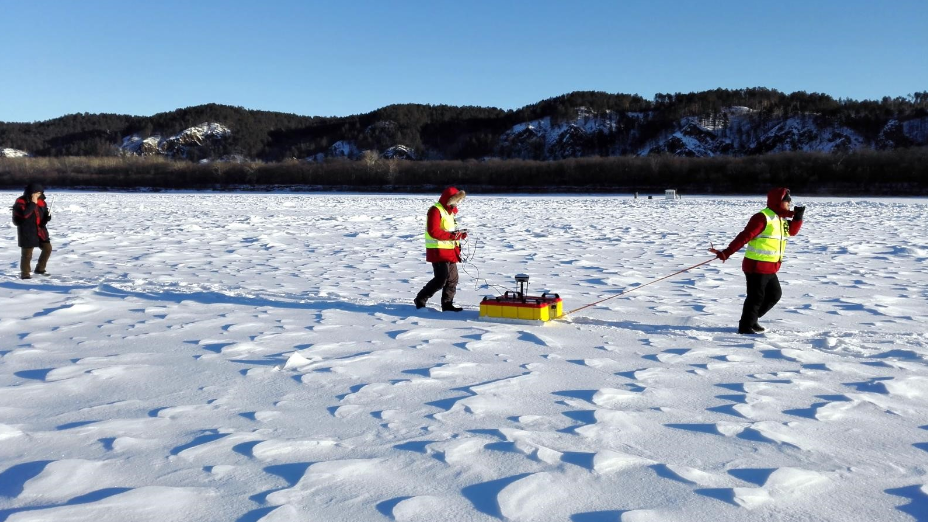 圖1? 冰厚水深綜合探測雷達在黑龍江漠河北極村段現場作業